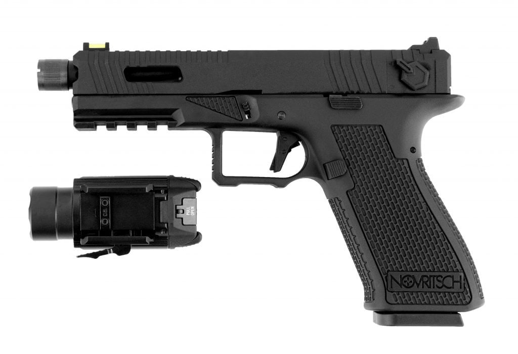 Agresif tırtıklar ve kavrama dokusu ile birleştirilmiş NOVRITSCH imzalı matkap görünümlü namlu, bu tabancayı benzersiz bir parça haline getiriyor
